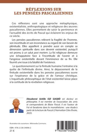 Ces réflexions sont une approche métaphysique, existentialiste et anthropo-religieuse des oeuvres pascaliennes. Elles permettent de saisir la pertinence et l'actualité des écrits de Pascal qui éclairent les enjeux de ce siècle. Les pensées pascaliennes relèvent la fragilité de l'homme, son incertitude et son inconstance eu égard à son besoin de plénitude. Elles appellent à prendre aussi en compte sa dimension spirituelle dans son devenir existentiel, puisqu'il est convié à un salut post mortem. La foi religieuse demeure une échappatoire face à l'incertitude de l'avenir et à l'angoisse existentielle devant l'imminence de sa fin. Elle fournit une issue à la fatalité de l'existence. Le questionnement sur la finitude humaine le conduit à la quête de l'infinitude divine. Ainsi, le dépassement de la finitude existentielle dans les pensées pascaliennes ouvre sur l'espérance de la grâce et de l'amour christique. L'inquiétude philosophique de l'état existentiel laisse place à la certitude de la révélation religieuse.