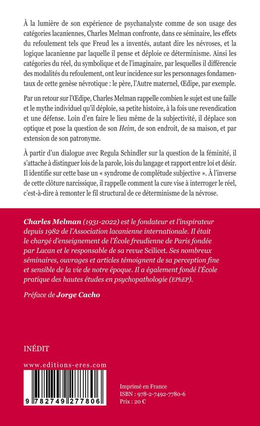 Dans cette perspective, on retiendra la confrontation entre les effets du refoulement tels que Freud les a inventés, autant dire, les névroses, et la logique lacanienne par laquelle Melman pense et déploie ce déterminisme. Ainsi les catégories du réel, du symbolique et de l’imaginaire par lesquelles il différencie des modalités du refoulement ont-elles leur incidence sur les personnages fondamentaux de cette genèse névrotique : le père, l’Autre maternel, Œdipe, par exemple.