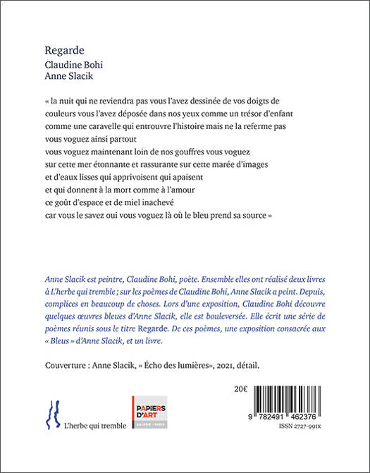 Anne Slacik est peintre, Claudine Bohi, poète. Ensemble elles ont réalisé deux livres à L’herbe qui tremble ; sur les poèmes de Claudine Bohi, Anne Slacik a peint. Depuis, complices en beaucoup de choses. Lors d’une exposition, Claudine Bohi découvre quelques œuvres bleues d’Anne Slacik, elle est bouleversée. Elle écrit une série de poèmes réunis sous le titre Regarde. De ces poèmes, une exposition consacrée aux « Bleus » d’Anne Slacik, et un livre.