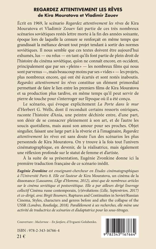 Regardez attentivement les rêves de Kira Mouratova et Vladimir Zouev fait partie des scénarios soviétiques restés lettre morte à la fin des années soixante, époque à laquelle la censure se renforçait en même temps que grandissait la méfiance devant tout projet tendant à sortir des normes. Il nous semble que ces textes doivent être aujourd'hui exhumés, tant ils font partie de plein droit de l'histoire du cinéma soviétique. Le scénario qui évoque explicitement La Porte dans le mur d'Herbert G. Wells, raconte l'histoire d'Ania, une peintre déchirée entre, d'une part, son désir de se consacrer pleinement à son art, et de l'autre, les soucis quotidiens mais aussi son amour pour ses proches. Objet singulier, faisant une large part à la rêverie et à l'imaginaire, Regardez attentivement les rêves est sans doute l'un des scénarios les plus personnels de Kira Mouratova.