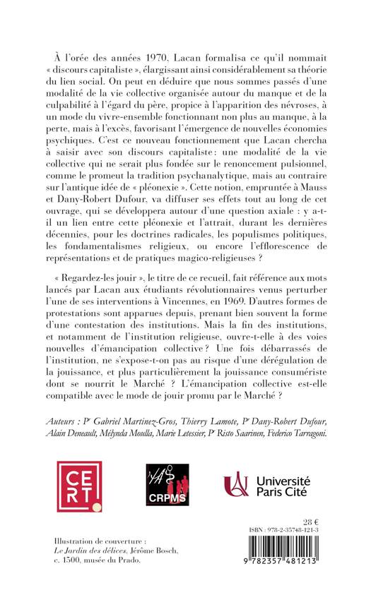 A l'orée des années 1970, Lacan formalisa ce qu'il nommait « discours capitaliste », élargissant ainsi considérablement sa théorie du lien social. On peut en déduire que nous sommes passés d'une modalité de la vie collective organisée autour du manque et de la culpabilité à l'égard du père, propice à l'apparition des névroses, à un mode du vivre-ensemble fonctionnant non plus au manque, à la perte, mais à l'excès, favorisant l'émergence de nouvelles économies psychiques. C'est ce nouveau fonctionnement que Lacan chercha à saisir avec son discours capitaliste : une modalité de la vie collective qui ne serait plus fondée sur le renoncement pulsionnel, comme le promeut la tradition psychanalytique, mais au contraire sur l'antique idée de « pléonexie », récemment ravivée par Mauss et Dany-Robert Dufour. Y a-t-il un lien entre cette pléonexie et l'attrait contemporain pour les doctrines radicales, les populismes politiques, les fondamentalismes religieux, ou encore l'efflorescence de représentations et de pratiques magico-religieuses ? « Regardez-les jouir », le titre de ce recueil, fait référence aux mots lancés par Lacan aux étudiants révolutionnaires venus perturber l'une de ses interventions à Vincennes, en 1969. D'autres formes de protestations sont apparues depuis, prenant bien souvent la forme d'une contestation des institutions. Mais la fin des institutions, et notamment de l'institution religieuse, ouvre-t-elle à des voies nouvelles d'émancipation collective ? Une fois débarrassés de l'institution, ne s'expose-t-on pas au risque d'une dérégulation de la jouissance, notamment la jouissance consumériste dont se nourrit le Marché ?