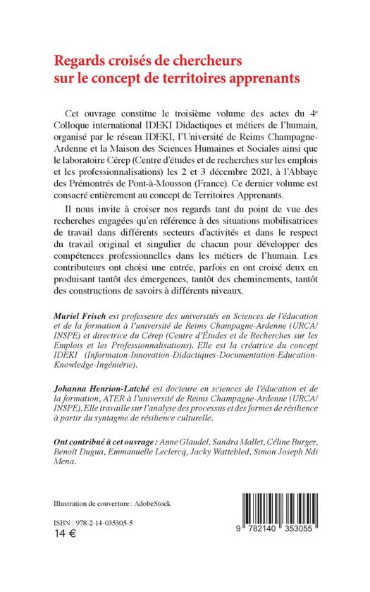 Cet ouvrage constitue le troisième volume des actes du 4e Colloque international IDEKI Didactiques et métiers de l'humain, organisé par le réseau IDEKI, l'Université de Reims Champagne-Ardenne et la Maison des Sciences Humaines et Sociales ainsi que le laboratoire Cérep (Centre d'études et de recherches sur les emplois et les professionnalisations) les 2 et 3 décembre 2021, à l'Abbaye des Prémontrés de Pont-à-Mousson (France). Ce dernier volume est consacré entièrement au concept de Territoires Apprenants. Il nous invite à croiser nos regards tant du point de vue des recherches engagées qu'en référence à des situations mobilisatrices de travail dans différents secteurs d'activités et dans le respect du travail original et singulier de chacun pour développer des compétences professionnelles dans les métiers de l'humain. Les contributeurs ont choisi une entrée, parfois en ont croisé deux en produisant tantôt des émergences, tantôt des cheminements, tantôt des constructions de savoirs à différents niveaux.