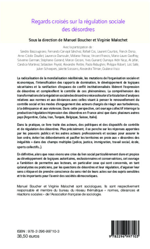 Voici interrogée la production/régulation/répression des désordres en France ainsi que dans plusieurs autres pays (Argentine, Cuba, Iran, Turquie, Belgique, Suisse, Italie). Quelles sont les réponses apportées par les pouvoirs publics et les acteurs professionnels et sociaux pour assurer le bon ordre, éviter les débordements ? Alors que nous vivons une crise du lien social, propice au développement de logiques autoritaires, exclusionnaires et conservatrices, voici une réflexion sur des sujets fondamentaux pour l'avenir des sociétés démocratiques.