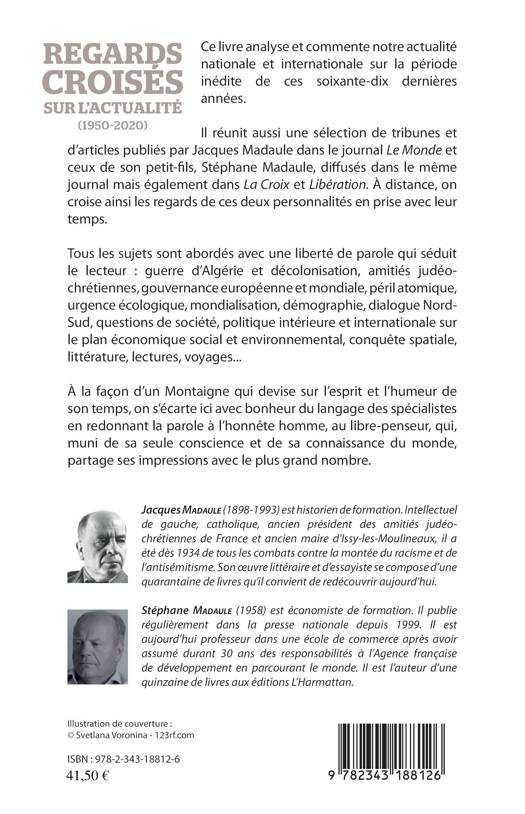 Cet ouvrage analyse et commente l'actualité nationale et internationale sur les soixante-dix dernières années. Il réunit une sélection de tribunes et d'articles publiés par Jacques Madaule et son petit-fils, Stéphane Madaule. À distance, on croise ainsi les regards de ses deux personnalités en prise avec leur temps. Tous les sujets sont abordés avec une véritable liberté de parole : guerre d'Algérie et décolonisation, amitiés judéo-chrétiennes, gouvernances européenne et mondiale, péril atomique, urgence écologique, etc. À la façon d'un Montaigne, on s'écarte ici avec bonheur du langage des spécialistes en redonnant la parole au libre-penseur qui, muni de sa seule conscience et de sa connaissance du monde, partage ses impressions avec le plus grand nombre.