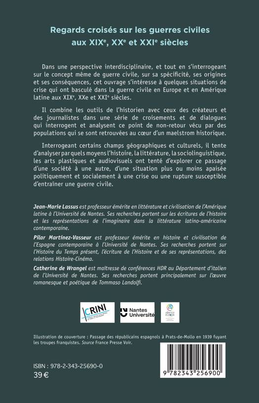 Dans une perspective interdisciplinaire, et tout en s'interrogeant sur le concept même de guerre civile, sur sa spécificité, ses origines et ses conséquences, cet ouvrage s'intéresse à quelques situations de crise qui ont basculé dans la guerre civile en Europe et en Amérique latine aux XIXe, XXe et XXIe siècles. Il combine les outils de l'historien avec ceux des créateurs et des journalistes dans une série de croisements et de dialogues qui interrogent et analysent ce point de non-retour vécu par des populations qui se sont retrouvées au coeur d'un maelstrom historique. Interrogeant certains champs géographiques et culturels, il tente d'analyser par quels moyens l'histoire, la littérature, la sociolinguistique, les arts plastiques et audiovisuels ont tenté d'explorer ce passage d'une société à une autre, d'une situation plus ou moins apaisée politiquement et socialement à une crise ou une rupture susceptible d'entraîner une guerre civile.
