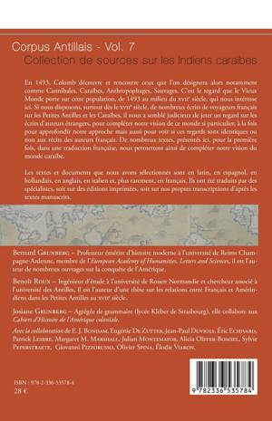 En 1493, Colomb découvre et rencontre ceux que l'on désignera alors notamment comme Cannibales, Caraïbes, Anthropophages, Sauvages. C'est le regard que le Vieux Monde porte sur cette population, de 1493 au milieu du xviie siècle, qui nous intéresse ici. Si nous disposons, surtout dès le xviie siècle, de nombreux écrits de voyageurs français sur les Petites Antilles et les Caraïbes, il nous a semblé judicieux de jeter un regard sur les écrits d'auteurs étrangers, pour compléter notre vision de ce monde si particulier, à la fois pour approfondir notre approche mais aussi pour voir si ces regards sont identiques ou non aux récits des auteurs français. De nombreux textes, présentés ici, pour la première fois, dans une traduction française, nous permettent ainsi de compléter notre vision du monde caraïbe. Les textes et documents que nous avons sélectionnés sont en latin, en espagnol, en hollandais, en anglais, en italien et, plus rarement, en français. Ils ont été traduits par des spécialistes, soit sur des éditions imprimées, soit sur nos propres transcriptions d'après les textes manuscrits.