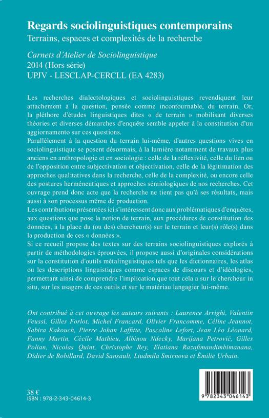 Les recherches dialectologiques et sociolinguistiques revendiquent leur attachement à la question, du terrain. Se posent désormais d'autres questions en sociolinguistique : celle de la réflexivité, du lien ou de l'opposition entre subjectivation et objectivation, de la complexité, ou encore des postures herméneutiques et approches sémiologiques de nos recherches. Ces contributions s'intéressent aux problématiques d'enquêtes, à la notion de terrain, aux procédures de constitution des données, au rôle des chercheurs dans la production de ces "données".