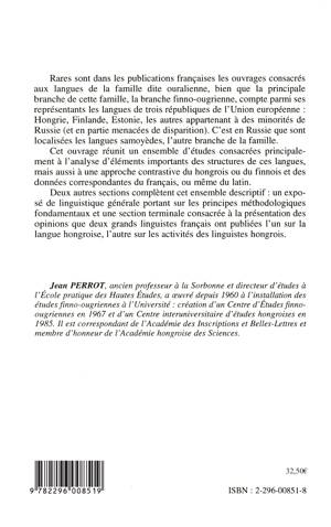 Cet ouvrage réunit un ensemble d'études consacrées principalement à l'analyse d'éléments importants des structures des langues de la famille dite ouralienne. Cette famille est divisée en deux branches : la branche finno-ougrienne (qui concerne les langues parlées en Hongrie, Finlande, Estonie et par des minorités de Russie) et la branche samoyède (dont les langues sont surtout localisées en Russie). Mais cette étude apporte également une approche contrastive du hongrois ou du finnois et des données correspondantes du français, ou même du latin.