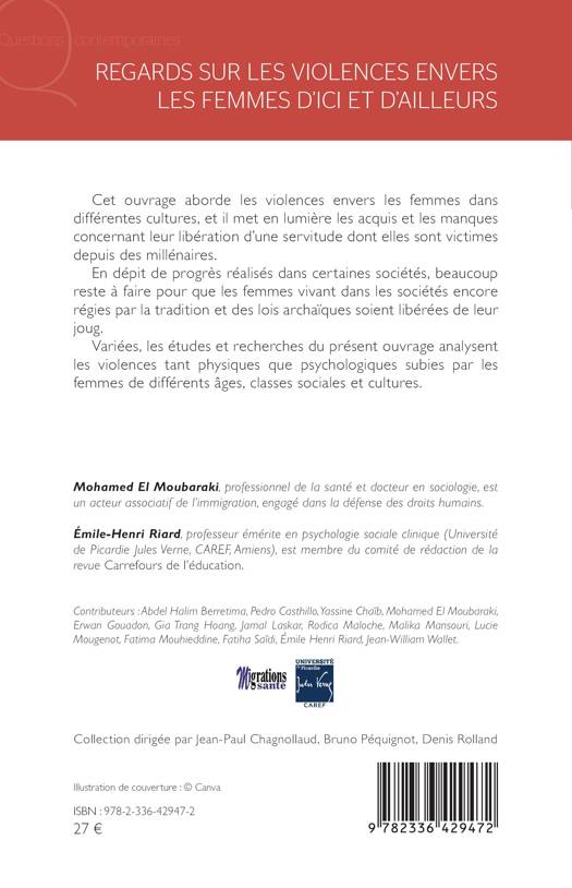 Cet ouvrage aborde les violences envers les femmes dans différentes cultures, et il met en lumière les acquis et les manques concernant leur libération d'une servitude dont elles sont victimes depuis des millénaires. En dépit de progrès réalisés dans certaines sociétés, beaucoup reste à faire pour que les femmes vivant dans les sociétés encore régies par la tradition et des lois archaïques soient libérées de leur joug. Variées, les études et recherches du présent ouvrage analysent les violences tant physiques que psychologiques subies par les femmes de différents âges, classes sociales et cultures.