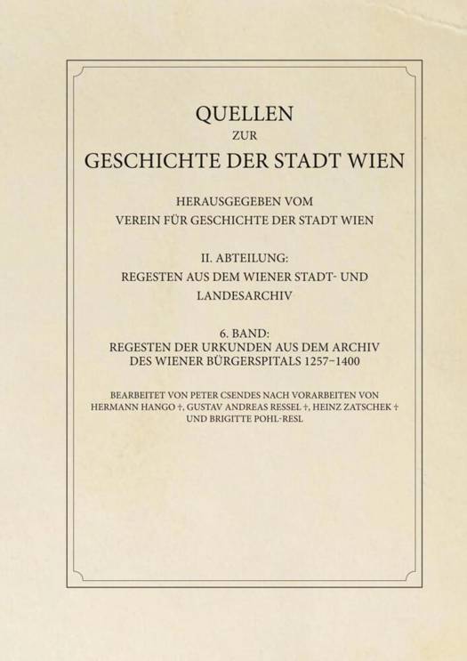 Durch rund 280 Jahre bis zur Zerstörung im Türkenkrieg von 1529 lag das Wiener Bürgerspital vor den Stadtmauern am Wienfluss. Diese wichtigste Versorgungs- und Krankenanstalt der Burger war über die Funktion hinaus für das soziale Gefüge der Stadt von großer Bedeutung. Das äußerte sich in zahlreichen frommen Stiftungen, die diese Institution auch zu einem bedeutenden Wirtschaftsfaktor werden ließen. Das Archiv des Bürgerspitals, das im Wiener Stadt- und Landesarchiv verwahrt wird, reicht bis zu den Anfängen im 13. Jahrhundert zurück. Den Kern aus dem genannten Zeitraum bilden rund 850 Originalurkunden sowie zahlreiche weitere Dokumente, die in zeitnaher kopialer Überlieferung vorliegen, vereinzelt auch in neuzeitlichen Abschriften. Die vorliegenden Regesten, die ein umfangreiches Namensmaterial für prosopographische und topographische Untersuchungen bereitstellen, sollen als Behelf für Forschung die Benutzung dieses außerordentlichen Quellenmaterials erleichtern, das nicht nur einen generellen Einblick in die Vorstellungen des späteren Mittelalters gibt, sondern auch die alltägliche Lebenswelt begreifbar und darstellbar macht.