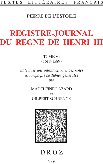 Sixième tome du Journal de Pierre de L’Estoile, qui constitue, de l’avis général, le document le plus important et le plus curieux pour la connaissance historique et littéraire de la fin du XVIe siècle en France. Pour la première fois, ce texte est édité d’après le manuscrit original fr. 6678 et les variantes du manuscrit fr. 6888 de la Bibliothèque nationale de France.