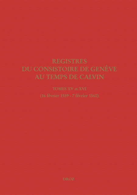 Publiés en un seul volume, les tomes XV et XVI des Registres du Consistoire de Genève couvrent l’année 1559 et le début de 1560. Une maladie grave empêche Calvin d’assister aux séances pendant plus de trois mois en hiver et au printemps, mais le Consistoire continue à imposer sa discipline même en l’absence du réformateur. En 1559, la création du Collège, destiné à l’éducation de la jeunesse genevoise, coïncide avec l’importance croissante que le Consistoire accorde à la pédagogie, comme en témoignent les nombreuses actions contre l’absentéisme au catéchisme, impliquant principalement des jeunes hommes. Si quelques Italiens sont attirés par les idées de Michel Servet contre le dogme de la Trinité, de nombreux Genevois embrassent la foi réformée avec enthousiasme comme le montre l’interdiction de réserver des places pour d’autres personnes dans les temples bondés de la ville. Parmi les actions qui concernent le contrôle du mariage, on peut signaler la validation du mariage d’un évêque français et de sa concubine et le divorce accordé au marquis Galéas Caracciolo, petit-neveu du pape Paul IV, en raison de désertion, parce que son épouse catholique refusait de quitter l’Italie et de le suivre à Genève.