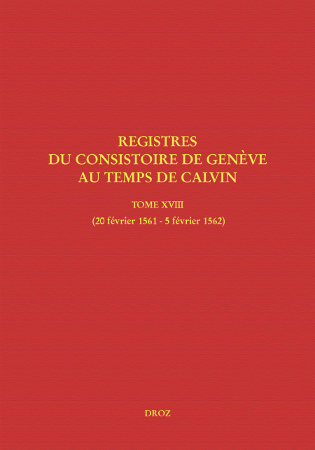 Le volume 18 des registres du Consistoire de Genève, qui couvre l'année 1561, soit l'année précédant le début des guerres de religion, fournit des preuves palpables des conflits qui sévissaient alors en France. Certains pasteurs notables se sont absentés de la ville pendant de longues périodes, notamment Pierre Viret, qui était au service des réformés à Nîmes, et Théodore de Bèze, qui a participé au Colloque de Poissy – tentative infructueuse de concilier les différences entre catholiques et protestants. On trouve dans ce volume un jugement sévère à l’encontre de l’anabaptisme et de fortes réprimandes envers la sœur de Sébastien Castellion qui affirmait que son frère, champion de la tolérance religieuse, était un homme bon. Le Consistoire continue à se montrer sceptique à l’égard des personnes soupçonnées de sorcellerie, et il s’attaque à l’ignorance religieuse de manière plus sévère qu’auparavant. Luttant toujours contre la prodigalité et la paresse, le Consistoire insiste même auprès du Conseil pour qu'il mette les pauvres au travail en creusant des fossés. Un exemple mémorable est celui de l'annulation d'une promesse de mariage faite sans le consentement des parents du jeune homme, étudiant français à l'Académie, et de la jeune femme, fille du pasteur François Bourgoin. N’ayant pas réussi à maintenir l’ordre au sein de sa famille, Bourgoin a d’ailleurs été destitué de sa charge à Genève et envoyé au service d’une église en France. Pour la première fois, les autorités ont poursuivi des personnes coupables d'avoir enfreint l'interdiction faite aux mariées de porter leurs cheveux sur les épaules lors de leur mariage, une pratique jugée impudique.
