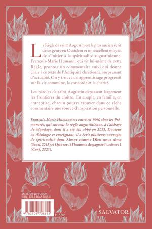 Inspirée d'une lettre de saint Augustin d'Hippone (354-430), cette règle de vie communautaire a été adoptée au fil du temps et jusqu'à nos jours par de nombreux ordres ou communautés religieuses les Prémontrés, les Dominicains, les Assomptionnistes, les Servites de Marie, etc. Quels sont les traits essentiels de ce texte ? Quelle spiritualité quotidienne promeuvent les huit chapitres qui la structurent ? En quoi cette règle est elle encore vivifiante pour des chrétiens au XXI e siècle ? Ce sont à ces questions que répond avec beaucoup de clarté et talent l'abbé de Juaye Mondaye (Calvados) de l'ordre des Prémontrés. François Marie Humann est né à Paris le 24 août 1970 Après des études de génie agronome, il entre au séminaire à l'âge de 23 ans, puis à l'abbaye de Juaye Mondaye en 1996 il est ordonné prêtre le 3 mai 2003 Il est élu le 15 octobre 2013 à 43 ans, le 48 e abbé de Mondaye depuis la fondation Il a longtemps accompagné l'équipe nationale du mouvement Foi et Lumière.