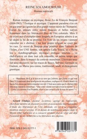 Roman érotique ou mystique, Reine Iza de François Bonjean (1884-1963) ? Érotique et mystique. L’apparent paradoxe n’en est un que pour qui ignore les plus grands textes sacrés de l’humanité. Certes les amours entre colons français et belles natives foisonnent dans les littératures dites de l’ère coloniale. Mais il en existe peu d’exemples dans lesquels un Européen admire à un tel degré la foi de sa promise. Un livre où les imams viennent consulter un « chrétien » sur leur propre religion ne court pas les rues. Le secret de Bonjean pour pénétrer dans l’univers de l’Islam, c’est une femme, son épouse Lalla Touria, ici « Reine Iza ». Autobiographique, mystique, érotique, courtois..., ce chef-d’oeuvre est donc tout cela ensemble, en même temps que féministe, dans le respect du contexte musulman. L’écrivain nous fait ainsi découvrir, sur les traces de Bosco, Sefrioui, Germain ou Guénon, un Maroc peu connu, traditionnel, soufi, et étrangement gnostique.