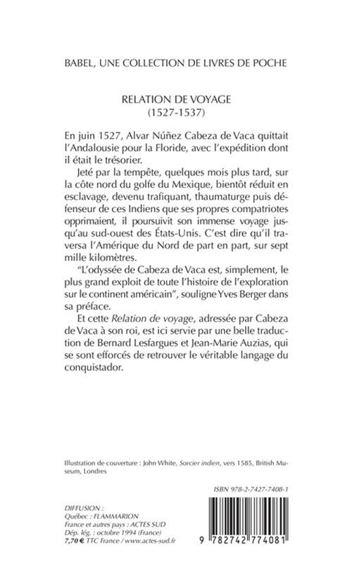 En juin 1527, Alvar Núñez Cabeza de Vaca quittait l'Andalousie pour la Floride, avec l'expédition dont il était le trésorier. Jeté par la tempête, quelques mois plus tard, sur la côte nord du golfe du Mexique, bientôt réduit en esclavage, devenu trafiquant, thaumaturge puis défenseur de ces Indiens que ses propres compatriotes opprimaient, il poursuivit son immense voyage jusqu'au sud- ouest des Etats-Unis. C'est dire qu'il traversa l'Amérique du Nord de part en part, sur sept mille kilomètres. "L'odyssée de Cabeza de Vaca est, simplement, le plus grand exploit de toute l'histoire de l'exploration sur le continent américain", souligne Yves Berger dans sa préface. Et cette Relation de voyage, adressée par Cabeza de Vaca à son roi, est ici servie par une belle traduction de Bernard Lesfargues et Jean-Marie Auzias, qui se sont efforcés de retrouver le véritable langage du conquistador.