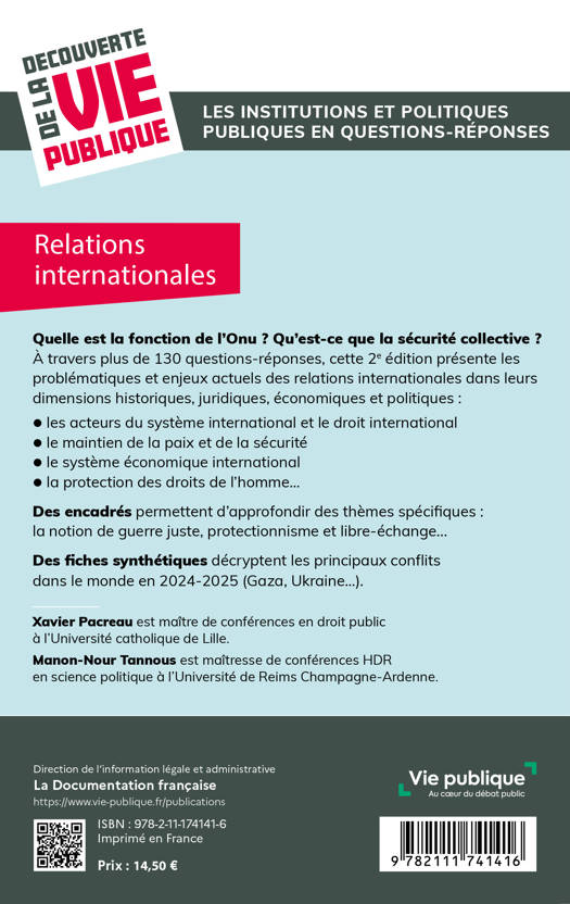 Cet ouvrage offre un tour horizon des relations internationales : - qu’est-ce que le système international et qui sont ses acteurs ? - qu’est-ce que le droit international ? Il propose des synthèses sectorielles : comment s’organise le maintien de la paix et de la sécurité internationales ? qu’est-ce que le système économique international ? comment la protection des droits de l’homme est-elle assurée ? où en est la protection internationale de l’environnement ? quid de l’aide publique au développement ?