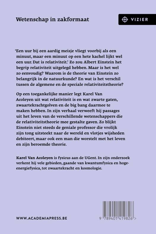 Op een toegankelijke manier legt Karel Van Acoleyen uit wat relativiteit is en wat zwarte gaten, zwaartekrachtgolven en de big bang daarmee te maken hebben. In zijn verhaal verweeft hij passages uit het leven van de verschillende wetenschappers die de relativiteitstheorie mee gestalte gaven. Zo blijkt Einstein niet steeds de geniale professor die vrolijk zijn tong uitsteekt naar de wereld en vlotjes wijsheden debiteert, maar ook een man die worstelt met het leven en zijn beroemde theorie.