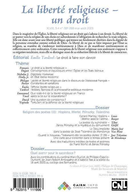 Dans le magistère de l'Église, la liberté religieuse est un droit qui s'adosse à un devoir. La liberté de se porter vers la religion de son choix est subordonnée à l'obligation de rechercher la vraie religion. Elle est donc avant tout une liberté publique, qui trouve un fondement chrétien dans la dignité de la personne entendue comme enfant de Dieu : la liberté de ne pas se faire imposer par l'État sa religion, sa manière de s'ordonner intérieurement à Dieu et de manifester extérieurement et collectivement cette ordination. Cette conception de la liberté religieuse non seulement s'oppose à sa négation totalitaire, mais elle se distingue aussi de sa réduction libérale à la liberté de conscience.