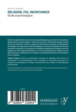 Éclairer les dynamismes et les structures psychologiques qui, au bord de la conscience, opèrent dans le champ religieux, voilà le but de ce livre, entièrement nouveau, fruit de 25 ans de recherches. L'auteur y analyse les motivations mouvantes et ambivalentes de la religion, les expériences et leurs ambiguïtés, les conflits qui habitent la foi et leurs résolutions croyantes ou incroyantes, les modalités singulières de la religion vécue, les pratiques et leurs dysfonctionnements. Ce livre fait comprendre les mutations et les effets, heureux ou malheureux, de la religion, les cheminements de la foi et les options de non-croyance.