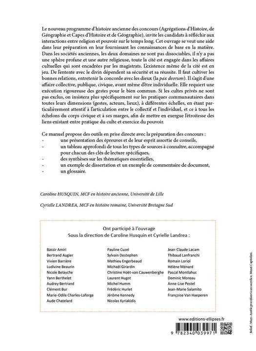 Cet ouvrage se veut une aide dans leur préparation en leur fournissant les connaissances de base en la matière. Dans les sociétés anciennes, les deux domaines ne sont pas dissociables, il n’y a pas une sphère profane et une autre religieuse, toute la cité est engagée dans les affaires cultuelles qui sont encadrées par les magistrats. L’existence même de la cité est en jeu. De l’entente avec le divin dépendent sa sécurité et sa réussite. Il faut cultiver les bonnes relations, entretenir la concorde avec les dieux (la pax deorum). Il s’agit d’une affaire collective, publique, civique, avant même d’être individuelle. Elle requiert une exécution rigoureuse des gestes pour le bien commun. Si les cultes privés ne sont pas exclus, on insistera plus spécifiquement sur les pratiques communautaires dans toutes leurs dimensions (gestes, acteurs, lieux), à différentes échelles, en étant particulièrement attentif à l’articulation entre le collectif et l’individuel, et ce à tous les échelons du corps civique et à ses marges, afin de mettre en exergue l’étroitesse des liens existant entre pratique du culte et exercice du pouvoir.