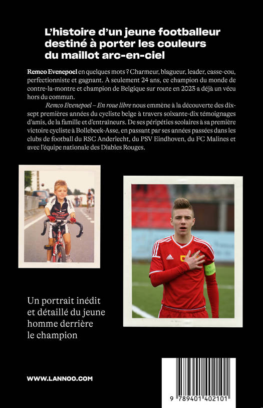 Remco Evenepoel – En roue libre nous emmène à la découverte des dix-sept premières années du cycliste belge à travers soixante-dix témoignages d'amis, de la famille et d'entraîneurs. De ses péripéties scolaires à sa première victoire cycliste à Bollebeek-Asse, en passant par ses années passées dans les clubs de football du RSC Anderlecht, du PSV Eindhoven, du FC Malines et avec l'équipe nationale des Diables Rouges.