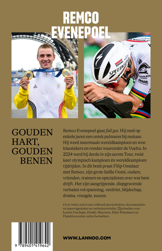 Remco Evenepoel gaat full gas. Hij reed op enkele jaren een uniek palmares bij mekaar. Hij werd meermaals wereldkampioen en won klassiekers en rondes waaronder de Vuelta. In 2024 werd hij derde in zijn eerste Tour, twéé keer olympisch kampioen én wereldkampioen tijdrijden. In dit boek praat Filip Osselaer met Remco, zijn grote liefde Oumi, ouders, vrienden, trainers en specialisten over wat hem drijft. Het zijn aangrijpende, diepgravende verhalen vol spanning, verdriet, blijdschap, drama, vreugde, succes.