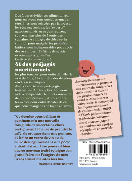 Des fausses évidences alimentaires,nous en avons tous quelques-unes en tête. Elles sont relayées par la presse,les réseaux sociaux, les "experts" autoproclamés, et se contredisent souvent : pas plus de 3 oeufs par semaine, le vinaigre de cidre est la solution pour maigrir, les produits laitiers sont indispensables pour avoir des os solides... Difficile de savoir exactement à qui se fier. Ce livre s'attaque donc à 41 des préjugés nutritionnels les plus tenaces, pour enfin démêler le vrai du faux, à la lumière des dernières études scientifiques. Avec sa clarté et sa pédagogie habituelles, Anthony Berthou nous aide à comprendre le fonctionnement de notre organisme ; il nous donne les armes pour enfin décider de ce que nous mangeons de façon éclairée.
