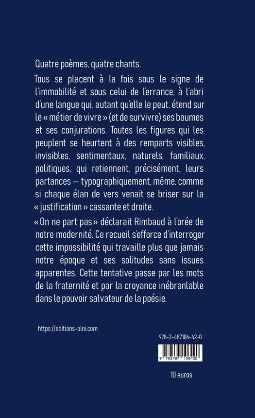 « On ne part pas » déclarait Rimbaud à l’orée de notre modernité. Ce recueil s’efforce d’interroger cette impossibilité qui travaille plus que jamais notre époque et ses solitudes sans issues apparentes. Cette tentative passe par les mots de la fraternité et par la croyance inébranlable dans le pouvoir salvateur de la poésie.