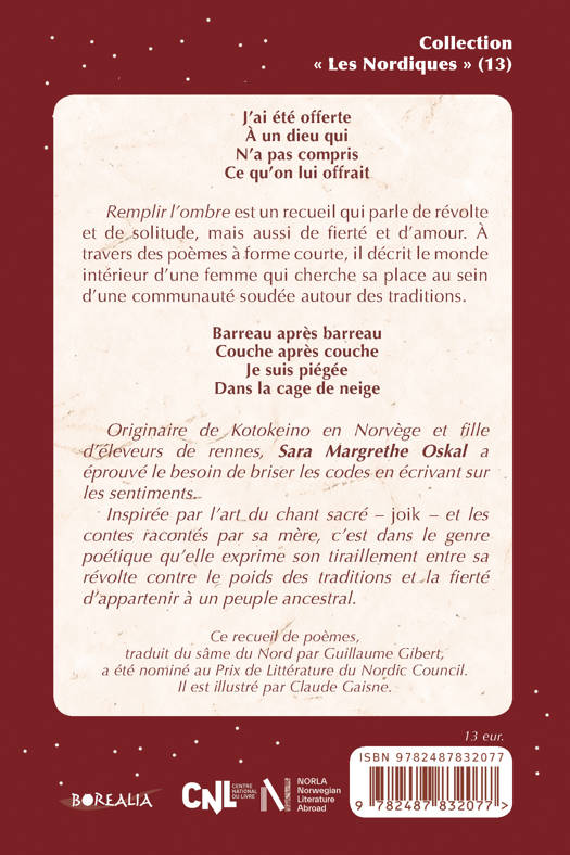 Originaire de Kotokeino en Norvège et fille d’éleveurs de rennes, Sara Margrethe Oskal a éprouvé le besoin de briser les codes en écrivant sur les sentiments. Inspirée par l’art du chant sacré – joik – et les contes racontés par sa mère, c’est dans le genre poétique qu’elle exprime son tiraillement entre sa révolte contre le poids des traditions et la fierté d’appartenir à un peuple ancestral.