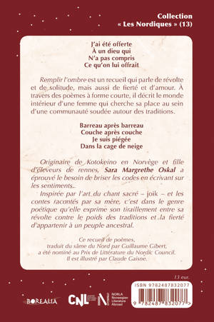 Remplir l’ombre est un recueil qui parle de révolte et de solitude, mais aussi de fierté et d’amour. À travers des poèmes à forme courte, il décrit le monde intérieur d’une femme qui cherche sa place au sein d’une communauté soudée autour des traditions.