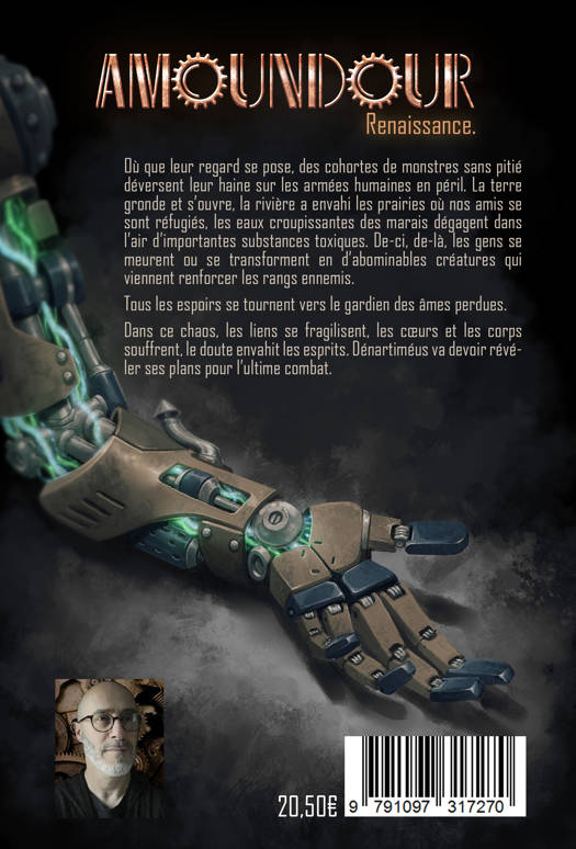 Résumé AMOUNDOUR 3- Renaissance ISBN : 979-10-97317-27-0 Où que leur regard se pose, des cohortes de monstres sans pitié déversent leur haine sur les armées humaines en péril. La terre gronde et s’ouvre, la rivière a envahi les prairies où nos amis se sont réfugiés, les eaux croupissantes des marais dégagent dans l’air d’importantes substances toxiques. De-ci, de-là, les gens se meurent ou se transforment en d’abominables créatures qui viennent renforcer les rangs ennemis. Tous les espoirs se tournent vers le gardien des âmes perdues. Dans ce chaos, les liens se fragilisent, les cœurs et les corps souffrent, le doute envahit les esprits. Dénartiméus va devoir révéler ses plans pour l’ultime combat. Genre : Fantastique, Steampunk. Young adult (15-25 ans et +)