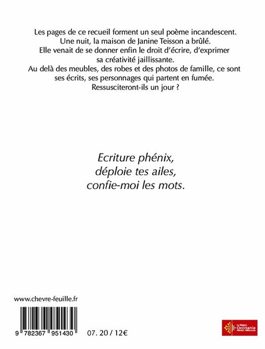Les pages de ce recueil forment un seul poème incandescent. Une nuit, la maison de Janine Teisson a brûlé. Elle venait de se donner enfin le droit d'écrire, d'exprimer sa créativité jaillissante.