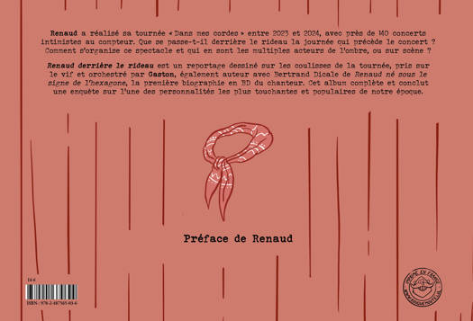 Renaud, qui fête ses 50 ans de carrière en 2025, a réalisé sa tournée « Dans mes cordes » entre 2023 et 2024, avec près de 150 concerts intimistes au compteur. Que se passe-t-il derrière le rideau la journée qui précède le concert ? Comment s’organise ce spectacle et qui en sont les multiples acteurs de l’ombre, ou sur scène ? Renaud derrière le rideau est un reportage dessiné sur les coulisses de la tournée, pris sur le vif et orchestré par Gaston, également auteur avec Bertrand Dicale de Renaud né sous le signe de l’hexagone, la première biographie en BD du chanteur. Cet album, dont Renaud signe la préface, complète et conclut une enquête sur l’une des personnalités les plus touchantes et populaires de notre époque.
