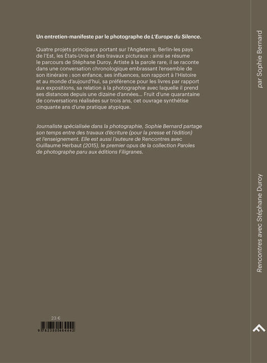 Quatre projets principaux portant sur l'Angleterre, Berlin et les pays de l'Est, et les Etats-Unis : ainsi se résument les quarante-cinq années de parcours de Stéphane Duroy. Artiste à la parole rare, il se raconte ici dans une conversation chronologique embrassant l'ensemble de son itinéraire : son rapport à l'Histoire et au monde d'aujourd'hui, sa relation à la photographie avec laquelle il prend ses distances depuis une dizaine d'années... Un entretien-manifeste par le photographe de L'Europe du Silence.