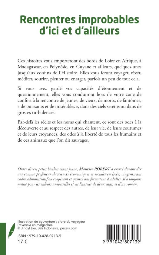 Ces histoires vous emporteront des bords de Loire en Afrique, à Madagascar, en Polynésie, en Guyane et ailleurs, quelques-unes jusqu'aux confins de l'Histoire. Elles vous feront voyager, rêver, méditer, sourire, pleurer ou enrager, parfois un peu de tout cela. Si vous avez gardé vos capacités d'étonnement et de questionnement, elles vous conduiront hors de votre zone de confort à la rencontre de jeunes, de vieux, de morts, de fantômes, de puissants et de misérables, dans des ciels sereins ou dans de grosses turbulences. Par-delà les récits et les noms qui chantent, ce sont des odes à la découverte et au respect des autres, de leur vie, de leurs coutumes et de leurs croyances, des odes à la liberté de tous les humains et de ces animaux que l'on dit sauvages.