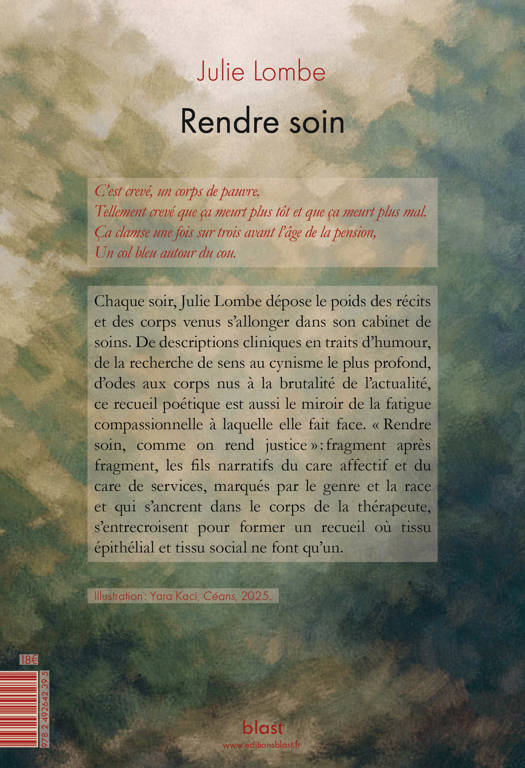 Chaque soir, Julie Lombe dépose le poids des récits et des corps venus s'allonger dans son cabinet de soins. De descriptions cliniques en traits d'humour, de la recherche de sens au cynisme le plus profond, d'odes aux corps nus à la brutalité de l'actualité, ce recueil poétique est aussi le miroir de la fatigue compassionnelle à laquelle elle fait face. « Rendre soin, comme on rend justice » : fragment après fragment, les fils narratifs du care affectif et du care de services, marqués par le genre et la race et qui s'ancrent dans le corps de la thérapeute, s'entrecroisent pour former un recueil où tissu épithélial et tissu social ne font qu'un.