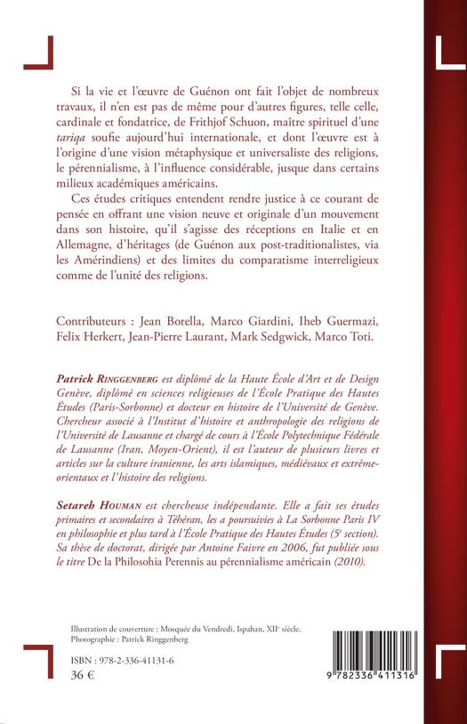 Si la vie et l'oeuvre de Guénon ont fait l'objet de nombreux travaux, il n'en est pas de même pour d'autres figures, telle celle, cardinale et fondatrice, de Frithjof Schuon, maître spirituel d'une tariqa soufie aujourd'hui internationale, et dont l'oeuvre est à l'origine d'une vision métaphysique et universaliste des religions, le pérennialisme, à l'influence considérable, jusque dans certains milieux académiques américains. Ces études critiques entendent rendre justice à ce courant de pensée en offrant une vision neuve et originale d'un mouvement dans son histoire, qu'il s'agisse des réceptions en Italie et en Allemagne, d'héritages (de Guénon aux post-traditionalistes, via les Amérindiens) et des limites du comparatisme interreligieux comme de l'unité des religions.