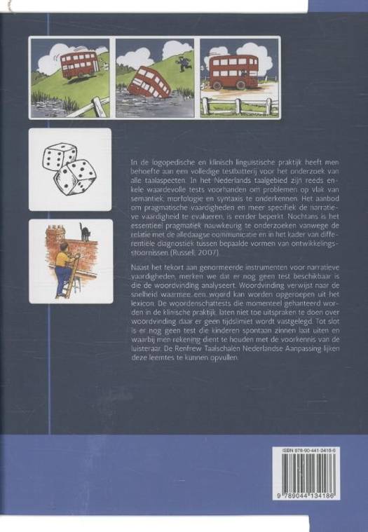 Set: Handleiding, scoreformulieren en Taalkaarten (in opbergkoffer). In de logopedische en klinisch linguïstische praktijk heeft men behoefte aan een volledige testbatterij voor het onderzoek van alle taalaspecten. In het Nederlands taalgebied zijn reeds enkele waardevolle tests voorhanden om problemen op vlak van semantiek, morfologie en syntaxis te onderkennen. Het aanbod om pragmatische vaardigheden en meer specifiek de narratieve vaardigheid te evalueren, is eerder beperkt. Nochtans is het essentieel pragmatiek nauwkeurig te onderzoeken vanwege de relatie met de alledaagse communicatie en in het kader van differentiële diagnostiek tussen bepaalde vormen van ontwikkelingsstoornissen (Russell, 2007). Naast het tekort aan genormeerde instrumenten voor narratieve vaardigheden, merken we dat er nog geen test beschikbaar is die de woordvinding analyseert. Woordvinding verwijst naar de snelheid waarmee een woord kan worden opgeroepen uit het lexicon. De woordenschattests die momenteel gehanteerd worden in de klinische praktijk, laten niet toe uitspraken te doen over woordvinding daar er geen tijdslimiet wordt vastgelegd. Tot slot is er nog geen test die kinderen spontaan zinnen laat uiten en waarbij men rekening dient te houden met de voorkennis van de luisteraar. De Renfrew Taalschalen Nederlandse Aanpassing lijken deze leemtes te kunnen opvullen.