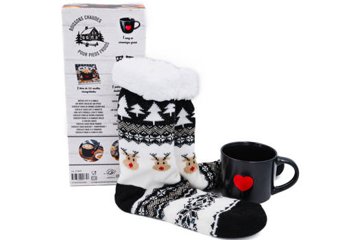 A l'intérieur, une confortable paire de chaussettes vertes à motif rennes douces et antidérapantes, un mug en céramique gravé, et un livre de 22 recettes réconfortantes : chocolat chaud à la noix de coco, Moka choco-noisette, muffins aux pommes, mug cakes red velvet....