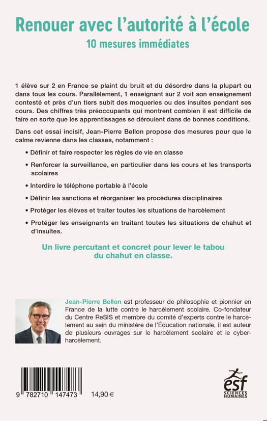 Dans cet essai incisif, Jean-Pierre Bellon propose des mesures pour que le calme revienne dans les classes, notamment :