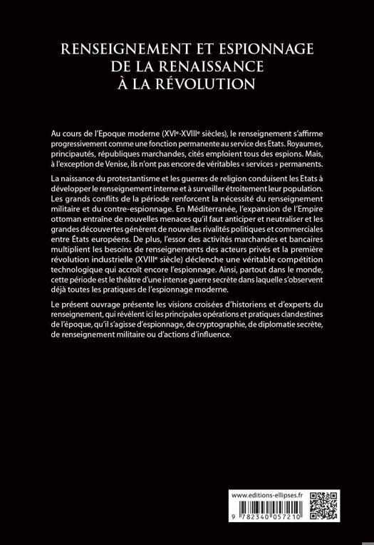 Le présent ouvrage – vingt-sept contributions produites par vingt-deux auteurs – présentent les visions croisées d’historiens et d’experts du renseignement, qui révèlent les principales opérations et pratiques clandestines de la Renaissance à la Révolution, qu’il s’agisse d’espionnage, de cryptographie, de diplomatie secrète, de renseignement militaire ou d’actions d’influence.