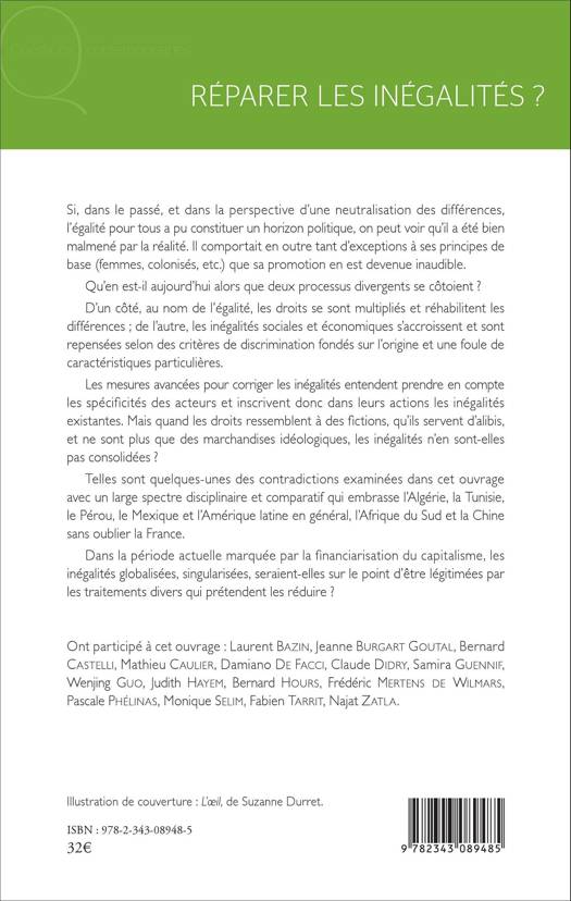 Dans le passé, l'égalité pour tous a pu constituer un horizon politique, on peut voir qu'il a été bien malmené par la réalité. Qu'en est-il aujourd'hui ? D'un côté, au nom de l'égalité, les droits se sont multipliés et réhabilitent les différences ; de l'autre, les inégalités sociales et économiques s'accroissent et sont repensées selon des critères de discrimination fondés sur l'origine et une foule de caractéristiques particulières. Ces contradictions sont examinées dans de multiples pays : l'Algérie, la Tunisie, le Pérou, la Mexique, l'Amérique latine, l'Afrique du Sud et la Chine, sans oublier la France.