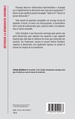 Pourquoi, dans les démocraties représentatives, le peuple est-il régulièrement en désaccord avec ceux qui le gouvernent ? Qu'est-ce que signifie le pouvoir du peuple ? Quel est-il ? Qu'est-ce qu'une démocratie ? Voici autant de questions auxquelles cet ouvrage essaie de répondre. Il incite, à travers ces interrogations, à reconsidérer notre vision de la démocratie, puis, ni plus ni moins, à la repenser, tous et toutes ensemble. Cette invitation à une discussion commune pour penser une autre démocratie, pour repenser nos capacités à agir, apparaît d'autant plus utile dans le contexte de crises que traversent nos sociétés. Car finalement, comme le conçoit Jérôme Devillard, repenser la démocratie c'est également repenser la société et trouver les moyens de la transformer.