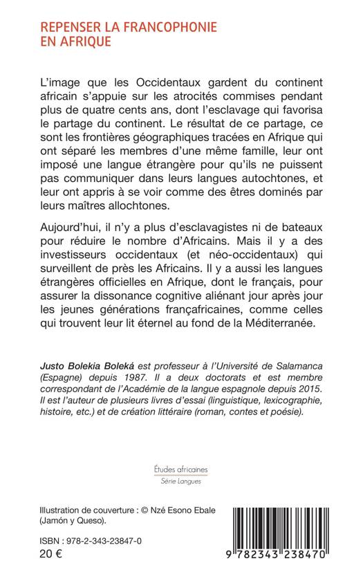 L'image que les Occidentaux gardent du continent africain s'appuie sur les atrocités commises pendant plus de quatre cents ans, dont l'esclavage qui favorisa le partage du continent. Le résultat de ce partage, ce sont les frontières géographiques tracées en Afrique qui ont séparé les membres d'une même famille, leur ont imposé une langue étrangère pour qu'ils ne puissent pas communiquer dans leurs langues autochtones, et leur ont appris à se voir comme des êtres dominés par leurs maîtres allochtones. Aujourd'hui, il n'y a plus d'esclavagistes ni de bateaux pour réduire le nombre d'Africains. Mais il y a les langues étrangères officielles en Afrique, dont le français, pour assurer la dissonance cognitive aliénant jour après jour les jeunes générations françafricaines.