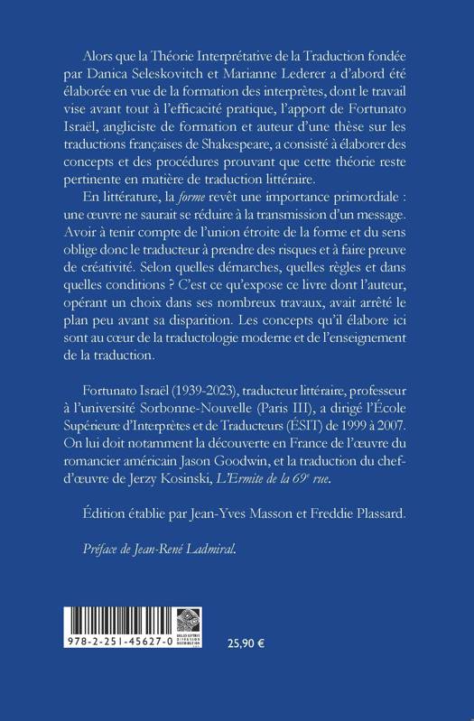 Alors que la Théorie Interprétative de la Traduction fondée par Danica Seleskovitch et Marianne Lederer a d’abord été élaborée en vue de la formation des interprètes, dont le travail vise avant tout à l’efficacité pratique, l’apport de Fortunato Israël, angliciste de formation et auteur d’une thèse sur les traductions françaises de Shakespeare, a consisté à élaborer des concepts et des procédures prouvant que cette théorie reste pertinente en matière de traduction littéraire.