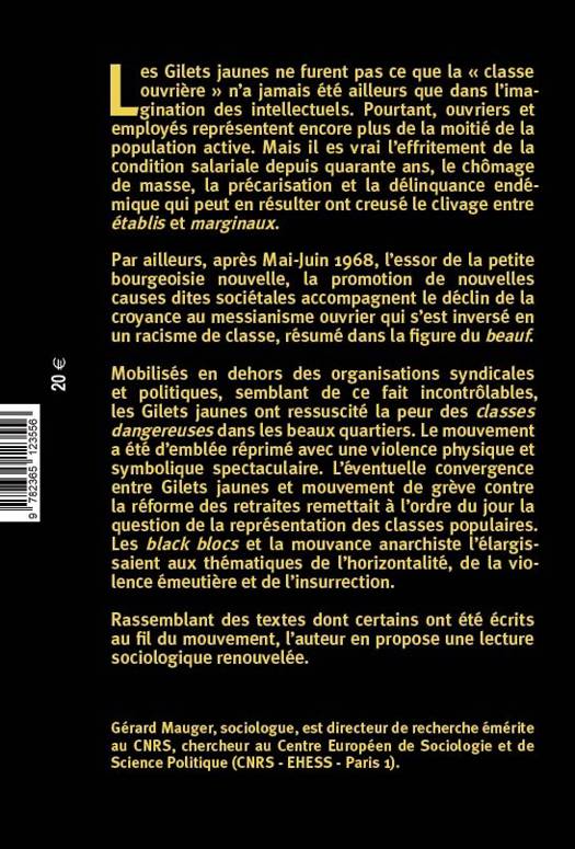 La compréhension du mouvement des Gilets jaunes passe par celle des transformations des classes populaires. Il est vrai qu’elles ne sont pas ce que « la classe ouvrière » n’a jamais été ailleurs que dans l’imagination des intellectuels, mais ouvriers et employées représentent encore plus de la moitié de la population active. Par ailleurs, l’effritement de la condition salariale au cours des quatre dernières décennies, l’extension du chômage de masse, la précarisation et l’insécurité sociale qui en résultent ont réactivé la menace de « déstabilisation des stables », creusant le clivage entre « établis » et « marginaux ». Le déclin post-soixante-huitard de la croyance au messianisme ouvrier, l’essor de la « petite bourgeoisie nouvelle » et la promotion de nouvelles causes dont elle se définit comme l’avant-garde permettent de rendre compte de l’invention d’une représentation disqualifiée des classes populaires dont la figure du « beauf » rassemble les stigmates. Ce genre de manifestations de la domination et du mépris de classe engendre à la fois l’humiliation et la colère, souvent tacites, des dominés et un ensemble de pratiques qu’inspire le souci de « respectabilité ». Résurgence inattendue des classes populaires supposées disparues, le mouvement des Gilets jaunes semblait d’autant plus insolite qu’il s’était mobilisé en dehors des organisations syndicales et politiques et qu’il semblait, de ce fait, incontrôlable. La peur des « classes dangereuses » ressurgissait dans les beaux quartiers. La mobilisation des Gilets jaunes était d’emblée confrontée à un déploiement de violence physique et symbolique spectaculaire. L’éventuelle convergence entre les Gilets jaunes et le mouvement de grève contre la réforme des retraites remettait à l’ordre du jour la question de la représentation. Les « black blocs » et la mouvance anarchiste l’élargissait aux thématiques de « l’horizontalité », de « la violence émeutière » et de « l’insurrection ». Gérard Mauger, sociologue, est directeur de recherche émérite au CNRS, chercheur au Centre Européen de Sociologie et de Science Politique (CNRS-EHESS-Paris I)