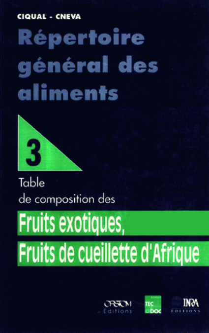 En 186 fiches de composition, cette table présente 145 fruits et leurs dérivés (jus, fruits séchés), répartis en deux grands groupes : 43 fruits cultivés, déjà rencontrés ou prochainement disponibles sur les marchés des pays développés, 102 fruits de cueillette consommés dans les régions tropicales et subtropicales, particulièrement en Afrique du Nord, de l'Ouest et du Centre. Les tableaux de composition indiquent les valeurs moyennes, mais aussi, chaque fois qu'il est possible, l'intervalle de variation et le nombre d'échantillons analysés. La valeur énergétique, la proportion de partie comestible et les teneurs en eau, protéines totales, lipides totaux, glucides disponibles, fibres, minéraux et vitamines sont rapportées à cent grammes de partie comestible. Les teneurs en acides aminés et en acides gras, ainsi que celles de certains sucres, oligo-éléments, acides organiques et aminés biogènes, sont parfois indiquées. L'introduction et le mode d'emploi de la table sont rédigés en français et en anglais. L'indexation multiple et bilingue permet à l'utilisateur d'accéder rapidement à la fiche de chaque produit, quel que soit le nom ou le synonyme sous lequel il connaît ("scientifique", français, anglais). De plus, les recherches sont facilitées par une table synoptique.