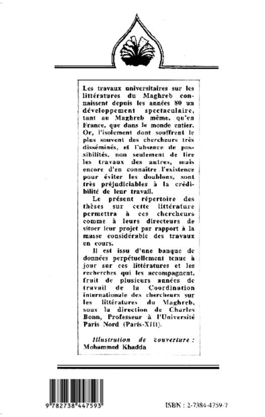 Les travaux universitaires sur les littératures du Maghreb connaissent depuis les années 80 un développement spéctaculaire, tant au Maghreb, en France, que dans le monde entier. Or, l'isolement dont souffrent les chercheurs très disséminés, et l'absence de possibilités, non seulement de lire les travaux des autres, mais encore d'en connaître l'existence pour éviter les doublons, sont très préjudiciables à la crédibilité de leur travail. Ce répertoire leur permet de situer leur projet.