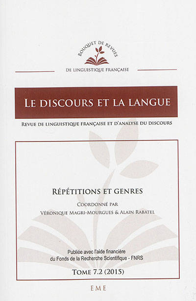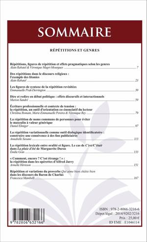 Répétitions, figures de répétition et effets pragmatiques selon les genres, Alain Rabatel & Véronique Magri-Mourgues / Des répétitions dans le discours religieux : l'exemple des litanies, Alain Rabatel / Les figures de syntaxe de la répétition revisitées, Emmanuelle Prak-Derrington / Dire et redire en débat politique : effets discursifs et interactionnels, Marion Sandré / Écriture professionnelle et contexte de tension : la répétition, un outil d'orientation co-énonciatif du lecteur…